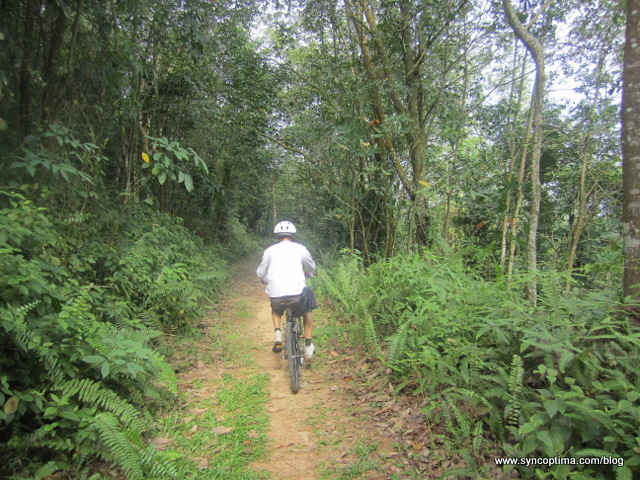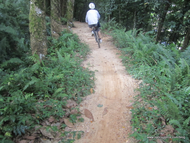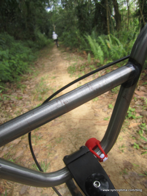 Even climbing up the roads that led to the trails had me huffing and puffing till I had to dismount and push the bike up. The climb were way too steep for what gearing my bike had. Finally we reached our entry and they were marked by their difficulty..RED: Experts ..BLUE: Intermediate…GREEN: Beginner. We both decided to go for BLUE since we consider ourselves really average in our bike handling skills. We were met with a fairly challenging single trail which had me tip toeing my little 20″ wheels through the rocks and terrain. The problem started when we started going down hill..with only one brake which was at the rear and with tyres that were meant for tarmac..I was literary going down hill sideways as my rear wheels were permanently locked. This didn’t help at all in slowing down the bike and had me having to bail off it a few times..my problem didn’t just end there; going up hill was way to technical for the gearing I have. The gradient wasnt much a problem but due to the narrow track I had to negotiate,the speed I was travelling was too slow for wat gearing I had. So dismounting was all I did anytime it when it went upwards. After a few times of doing this ,we decided to try the Green ( beginner) course which was barely do’able 😛